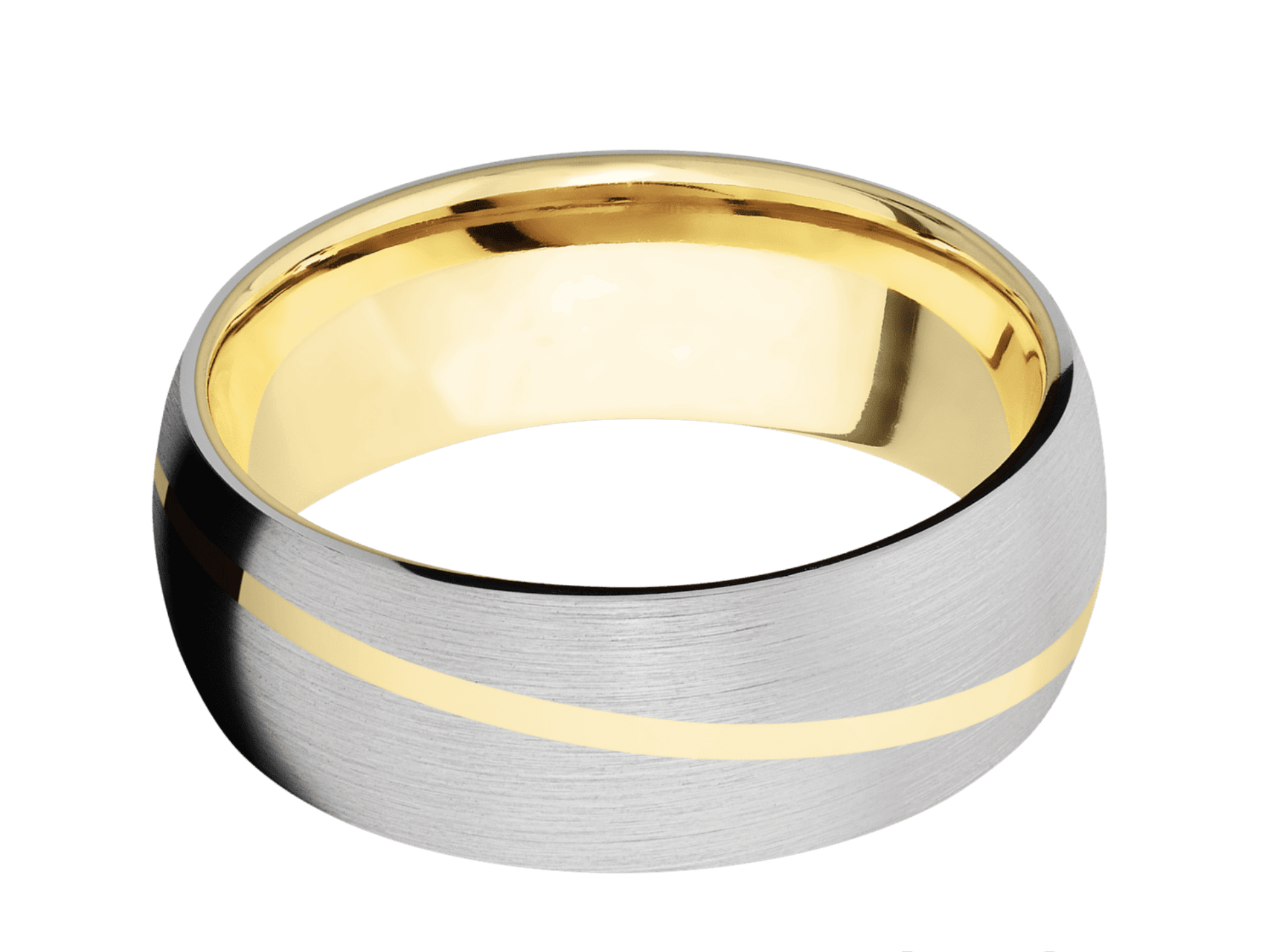 8 mm wide/Domed/14K White Gold band with one 1 mm Angled inlay of 14K Yellow Gold also featuring a 14K Yellow Gold sleeve.